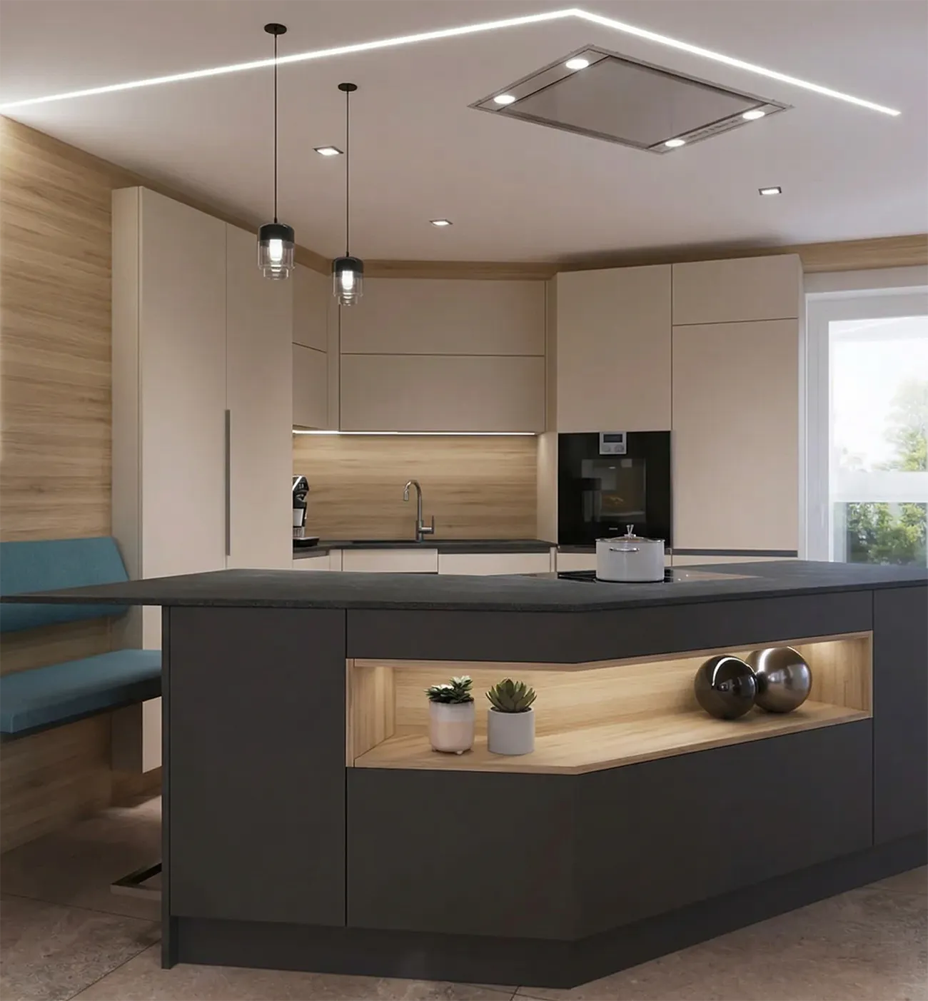 Küche mit Kochinsel in schwarz mit Holzoptik